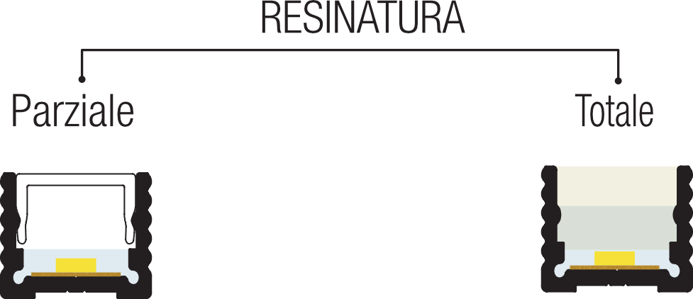 Il processo di resinatura garantisce alle lampade una protezione dagli agenti esterni. Le resine utilizzate nella protezione dei led sono di tipo poliuretanico trasparente e poliuretanico opale.