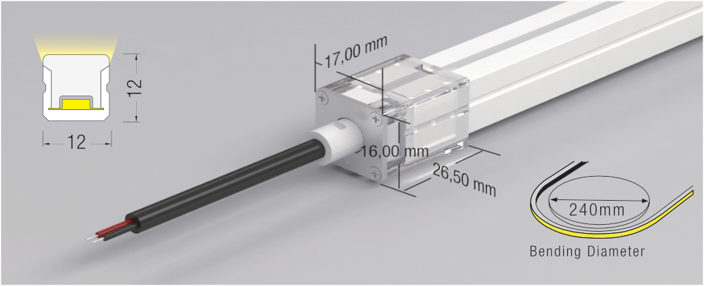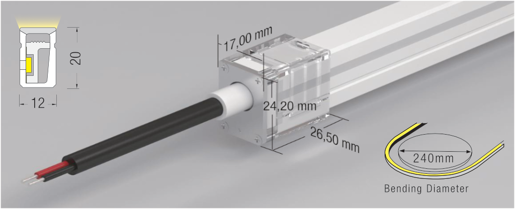 | 12×20 | 10 watt/mt – 15 watt/mt | ≥330 lm/mt – ≥350 lm/mt | 2700/3000/4000 K | 20.5×17.6×1000 mm |